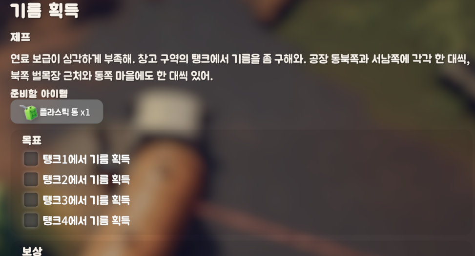 창고 구역에 있는 기름탱크 4곳에서 상호작용 하는 퀘스트